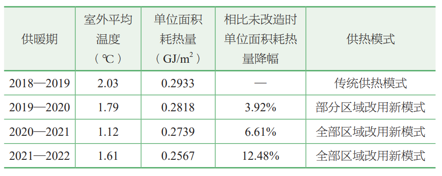 上述技術(shù)已成功應(yīng)用于大連開(kāi)熱并網(wǎng)面積933萬(wàn)㎡的供熱區(qū)域,通過(guò)建設(shè)自動(dòng)運(yùn)行調(diào)節(jié)的智慧供熱模式,實(shí)現(xiàn)了人工調(diào)控的傳統(tǒng)供熱模式向自動(dòng)化、智能化的智慧供熱模式的轉(zhuǎn)變;同時(shí)提高了供熱質(zhì)量,整個(gè)供暖期用戶室內(nèi)溫度波動(dòng)控制在±0.5℃范圍,實(shí)現(xiàn)了“恒室內(nèi)溫度”管控,杜絕了用戶投訴(改造前后24h內(nèi)室內(nèi)溫度監(jiān)測(cè)曲線對(duì)比圖見(jiàn)圖2);在生產(chǎn)方面實(shí)現(xiàn)了日計(jì)劃、日統(tǒng)計(jì)、日分析的(熱、水、電)能耗指標(biāo)數(shù)字化精細(xì)管控,進(jìn)一步降低了能耗指標(biāo)。截至2021-2022供暖期,熱力站單位面積耗電量降至0.390kWh/㎡,熱力站單位面積耗熱量降至0.2567GJ/㎡,能耗水平在供熱行業(yè)達(dá)到先進(jìn)水平。采用傳統(tǒng)供熱模式與采用智慧供熱新模式的單位面積耗熱量對(duì)比見(jiàn)表2。