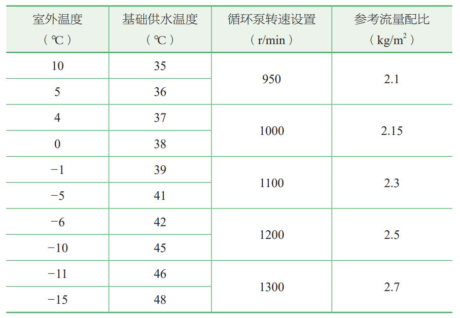 依據(jù)建立的負(fù)荷預(yù)測(cè)模型與自動(dòng)調(diào)節(jié)控制系統(tǒng)邏輯,通過(guò)自動(dòng)運(yùn)行參數(shù)設(shè)置模塊,進(jìn)行對(duì)應(yīng)室外溫度條件下的供水溫度與循環(huán)泵轉(zhuǎn)速參數(shù)設(shè)置。為達(dá)到供暖效果提升的目的,將目標(biāo)室內(nèi)溫度參數(shù)和調(diào)節(jié)系數(shù)作為人為干預(yù)參數(shù),在基礎(chǔ)供水溫度的基礎(chǔ)上,利用負(fù)荷預(yù)測(cè)模型的模擬功能,自動(dòng)計(jì)算并設(shè)置供水溫度。循環(huán)泵轉(zhuǎn)速按照參考流量配比在供暖初期人為進(jìn)行設(shè)定,在供暖期即可依靠智慧供熱模式參照對(duì)應(yīng)室外溫度自動(dòng)調(diào)節(jié)循環(huán)泵轉(zhuǎn)速,實(shí)現(xiàn)“分階段、變流量”的目的,達(dá)到調(diào)節(jié)耗電量的效果(自動(dòng)運(yùn)行參數(shù)設(shè)置模塊參考數(shù)據(jù)表見(jiàn)表1)。例如當(dāng)日室外溫度為-15~-5℃時(shí),傳統(tǒng)供熱調(diào)節(jié)模式下,因無(wú)法對(duì)區(qū)域內(nèi)180個(gè)機(jī)組同時(shí)進(jìn)行循環(huán)泵轉(zhuǎn)速調(diào)節(jié),為滿足用戶側(cè)熱負(fù)荷需求,只能按照當(dāng)日最低氣溫(-15℃)條件下對(duì)應(yīng)的流量配比2.7kg/㎡設(shè)置該機(jī)組循環(huán)泵轉(zhuǎn)速為1300r/min,其余時(shí)段通過(guò)質(zhì)調(diào)節(jié)調(diào)整供水溫度控制供熱量。而采用智慧供熱模式后,可以由自動(dòng)調(diào)節(jié)控制系統(tǒng)按照當(dāng)日各時(shí)段的室外溫度自行對(duì)180個(gè)機(jī)組下達(dá)循環(huán)泵轉(zhuǎn)速調(diào)節(jié)指令,在日間溫度在-10~-6℃時(shí),該機(jī)組循環(huán)泵將自動(dòng)調(diào)節(jié)轉(zhuǎn)速至1200r/min;日間溫度升高至-5℃以上時(shí),該機(jī)組循環(huán)泵將自動(dòng)調(diào)節(jié)轉(zhuǎn)速至1100r/min。智慧供熱模式使循環(huán)泵轉(zhuǎn)速實(shí)現(xiàn)分時(shí)段調(diào)節(jié),避免了傳統(tǒng)供熱模式下循環(huán)泵頻繁高轉(zhuǎn)速運(yùn)行造成的電能浪費(fèi),實(shí)現(xiàn)大幅降低機(jī)組耗電量的目的。