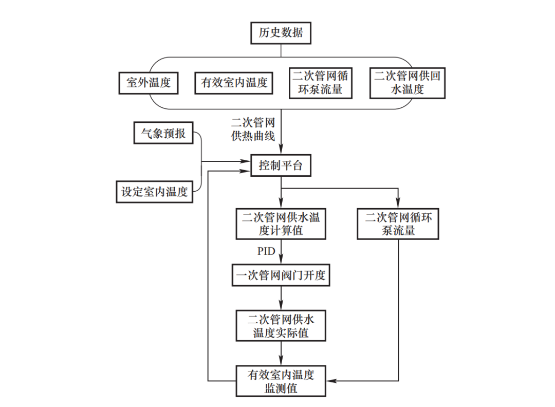 建立室內(nèi)溫度監(jiān)測(cè)分析體系后,可以獲取各供熱機(jī)組對(duì)應(yīng)供熱區(qū)域的有效平均室內(nèi)溫度。將用戶平均室內(nèi)溫度作為重要運(yùn)行參數(shù),引入熱力站運(yùn)行控制邏輯中,調(diào)節(jié)系統(tǒng)運(yùn)行,建立供水溫度自動(dòng)調(diào)節(jié)控制系統(tǒng)。