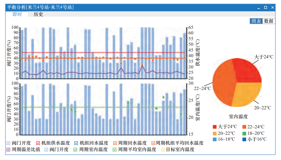 第二,按照不同類型(中間單元、邊角單元、別墅)分別按照對應的室內(nèi)溫度數(shù)據(jù)分析回水溫度調(diào)節(jié)系數(shù),提高控制精度,實現(xiàn)精細化調(diào)整,并通過手持流量計進行現(xiàn)場詳細測量和驗證(米蘭世紀小區(qū)4號站平衡分析圖見圖2)。