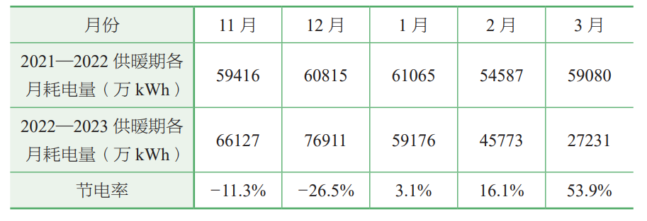 通過調(diào)試后的實際運行,耗電量降低較為明顯。2021-2022供暖期和2022-2023供暖期耗電量統(tǒng)計如表1所示,2022年11-12月份由于數(shù)據(jù)對接和調(diào)試,耗電量高于2021年同時期;2023年1月開始通過逐步調(diào)整二次管網(wǎng)平衡及循環(huán)泵頻率,節(jié)電效果明顯。參照電表數(shù)據(jù),與2022年3月同期比節(jié)電53.9%,考慮到氣溫、相關(guān)數(shù)據(jù)誤差等影響因素,最終節(jié)電量按照電表顯示數(shù)據(jù)70%進行計算,米蘭世紀小區(qū)同比節(jié)電率達到37.7%。