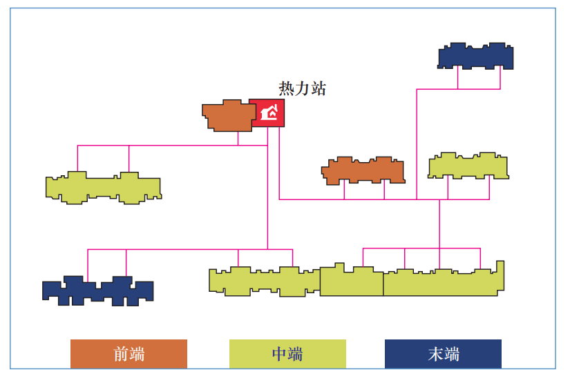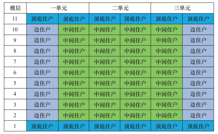 室內(nèi)溫度采集器安裝在具有代表性的室內(nèi)供暖區(qū)域,考慮到用戶接受程度和使用效果,擬選取10%的用戶作為典型用戶進行安裝,典型用戶的選取要考慮到邊住戶、頂?shù)鬃簟⒅虚g住戶、最不利工況用戶等,覆蓋絕大部分用戶的用熱形式及圍護結(jié)構(gòu)(圖1)。